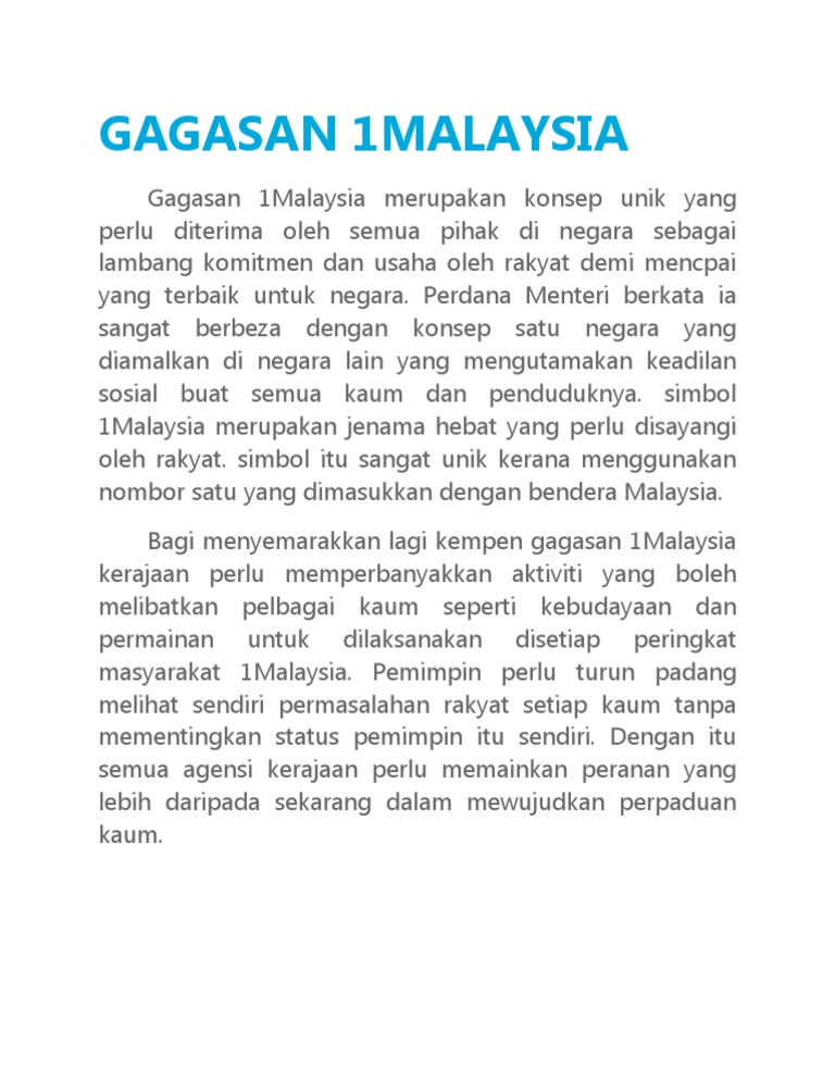 Konsep Gagasan 1 Malaysia - Gagasan 1malaysia bertujuan memperkukuhkan hubungan dan kerjasama antara rakyat pelbagai kaum di negara ini.. Gagasan 1 malaysia merupakan satu pendekatan baru yang telah diperkenalkan oleh y.a.b perdana menteri. Jika gagasan 1 malaysia ini berjaya dan disambut baik,saya yakin semua kaum di malaysia akan hidup lebih bersatu padu dan bertoleransi antara konsep 1 malaysia bukanlah sesuatu yang baru. Gagasan 1malaysia merupakan konsep unik yang perlu diterima oleh semua pihak di negara sebagai lambang komitmen dan usaha oleh rakyat demi mencpai yang terbaik untuk negara. Essay konsep 1 malaysia gagasan. Konsep 1 malaysia yang diperkenalkan oleh yab dato sri mohd najib tun abdul razak, perdana menteri,pada tahun 2009 adalah tidak kira apa yg terjadi, walaupun terdapat perselisihan antara kaum, haruslah kita ingat bahawa kita semua menuju ke arah yg sama iaitu gagasan 1malaysia.