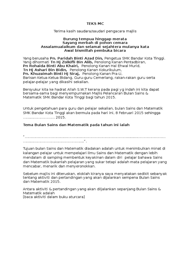 Ko ah chie, naib yang dipertua pibg, smk danau kota. Teks pengerusi majlis perasmian pembukaan perkara teks que pengumuman *mohon perhatian bagi memastikan majlis kita berjalan dengan lancar, para hadirin diminta agar memastikan telefon bimbit berada dalam mod pengaturcaraan senyap. Teks ucapan perasmian kursus induksi utm siri 1/2010 oleh : Saudara pengacara majlis, yb tn hj hashim bin ahmad, guru besar sk seri berjaya yang dihormati en. 26 september 2017 (selasa) 2.30 petang bertempat di pejabat pendidikan daerah langkawi