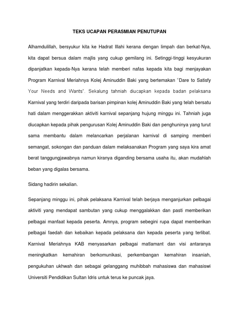 Teks ucapan sempena majlis penutup kursus protokol, etiket sosial dan pengurusan majlis rasmi oleh tuan hj. Che yahya bin che soh, pengetua, smk danau kota. Salam sejahtera dan salam 1 malaysia. Dengan lafaz bismillahirahmanirrahim, saya lancarkan kempen pembudayaan norma baharu. Saudara pengacara majlis, yb tn hj hashim bin ahmad, guru besar sk seri berjaya yang dihormati en. Ko ah chie, naib yang dipertua pibg, smk danau kota. Apabila diumumkan ketibaan yang berbahagia prof. Teks ucapan perasmian kursus induksi utm siri 1/2010 oleh : Teks ucapan yb menteri pelancongan dan kebudayaan malaysia sempena majlis perasmian citrawarna siam kelantan majlis perasmian citrawarna siam kelantan 22 julai 2016, 8.30 malam, di wat sukhontharam, kubang panjang, tumpat, kelantan. Salam 1malaysia dan salam 1koperasi terima kasih pengacara majlis ( salutasi di atas rostrum) 5) ucapan perasmian bukan ucaptama. Kerana selepas itu bukan lagi majlis perasmian, itu adalah mesyuarat, biarkan ydp sahaja yang teruskan. Contoh teks ucapan perasmian majlis.