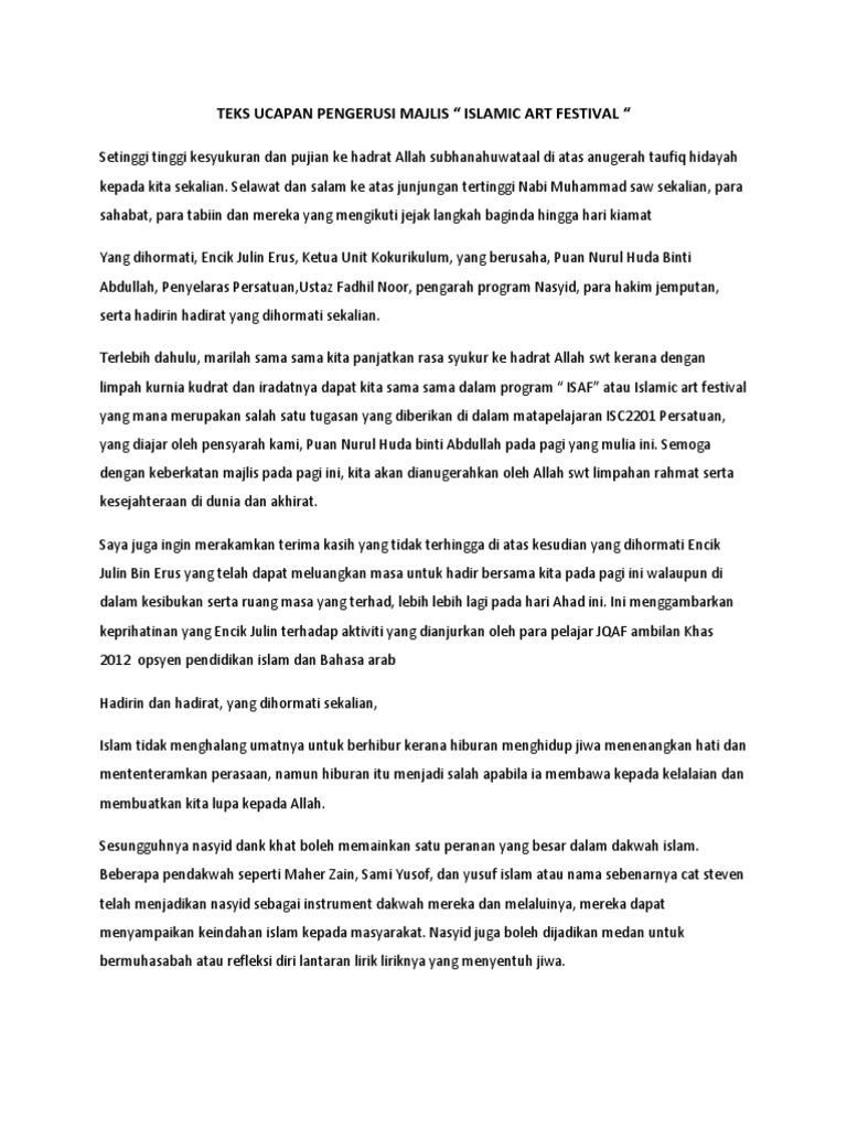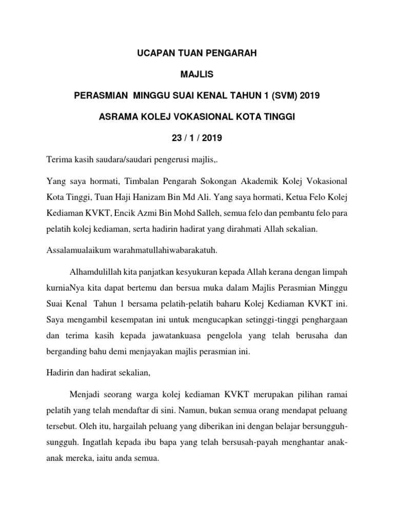 Contoh Soal Dan Materi Pelajaran 8 Contoh Ucapan Kata Kata Aluan Majlis from lh6.googleusercontent.com Teks ucapan pengarah projek majlis perasmian. Doc teks ucapan pengerusi majlis ceramah agama docx dr muhammad nur azimi azizan academia edu. Noraini ahmad menteri pengajian menteri pengajian tinggi; Yang diraikan pelajar program dakwah dan pengurusan islamtahun 4 dan hadirin hadirat yang dirahmati allah sekalian. Adnan bin ibon timbalan ketua pengarah. Biro pengaduan awam jabatan perdana menteri. To view this page ensure that adobe flash player version 10.0.0 or greater is installed. Teks ucapan ketua pengarah program.